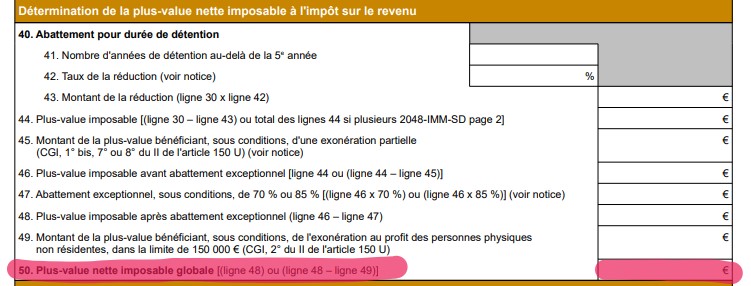 La somme à inscrire est le montant de la plus-value nette imposable à l’impôt sur le revenu, après abattements fiscaux en fonction de la durée de détention, et non la plus-value brute. En principe le contribuable ne peut pas faire d’erreur, s’il a reporté le montant figurant sur le formulaire Cerfa 2048-IMM (cette somme est bien une plus-value nette).